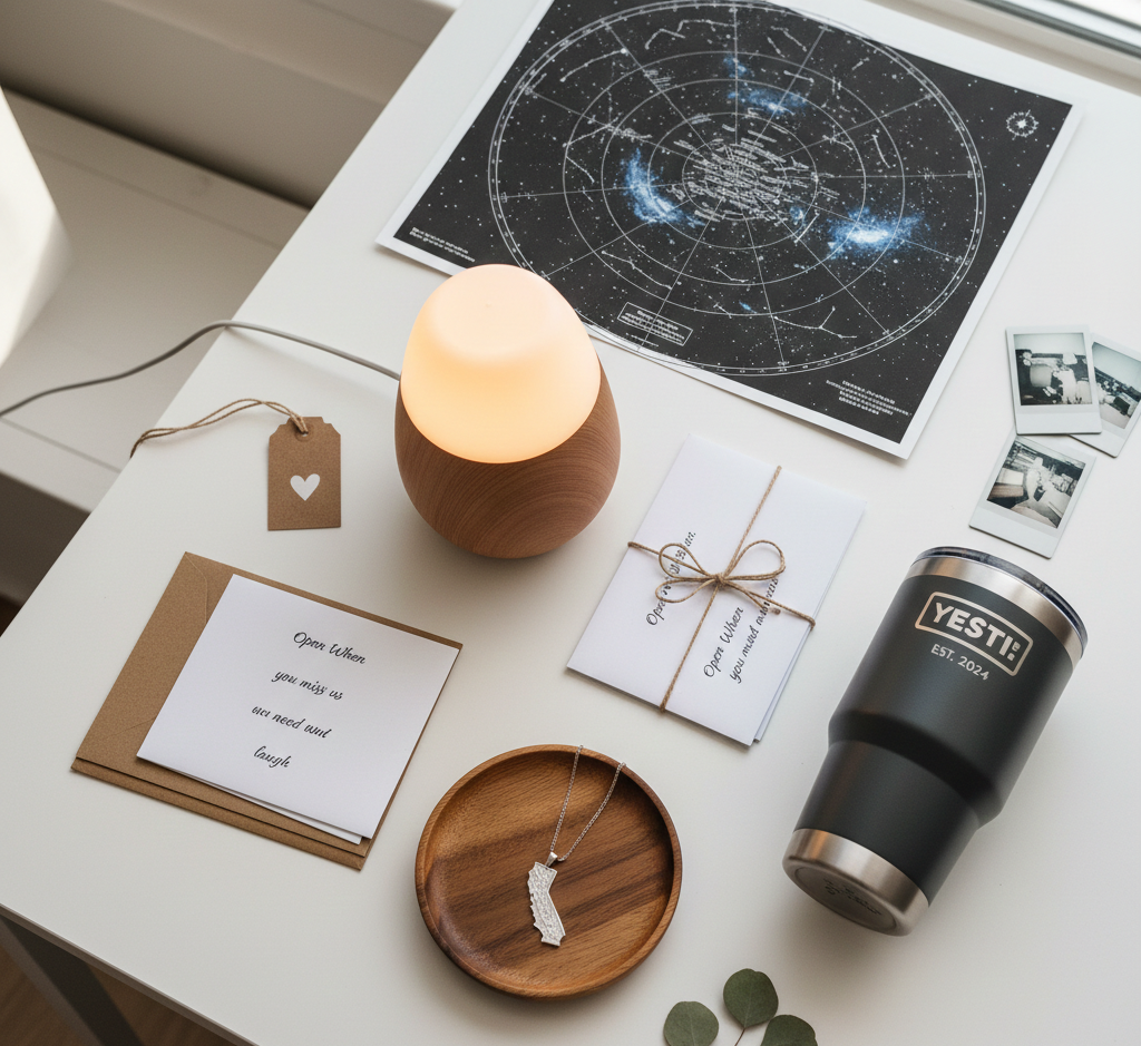 Go for items that connect them to home: a custom state necklace, local coffee beans, or a friendship lamp. Avoid heavy or fragile items. Gift cards for their new city (restaurants, home stores) and a Tiing money pot for moving expenses are always safe and appreciated choices.