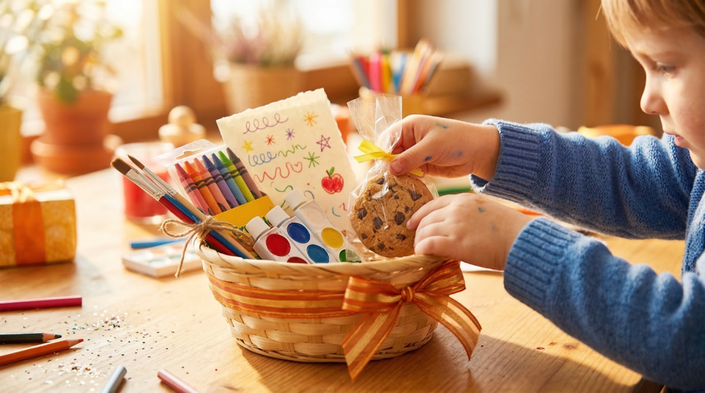 - Themed gift basket assembled by kids β School supplies + treats. $20 β $40