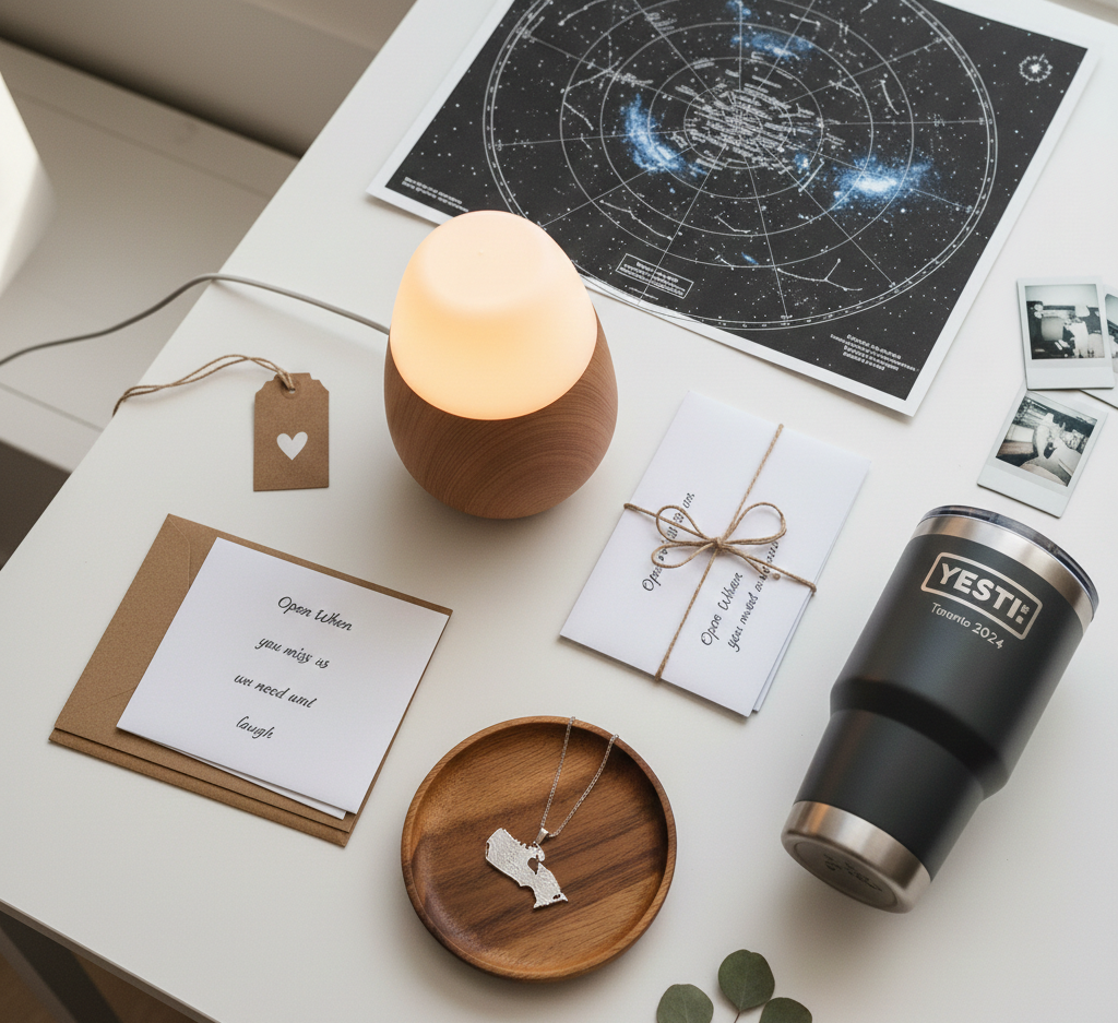 Go for items that connect them to home: a custom province necklace, local coffee beans, or a friendship lamp. Avoid heavy or fragile items. Gift cards for their new city and a Tiing money pot for moving expenses are always safe and appreciated choices.