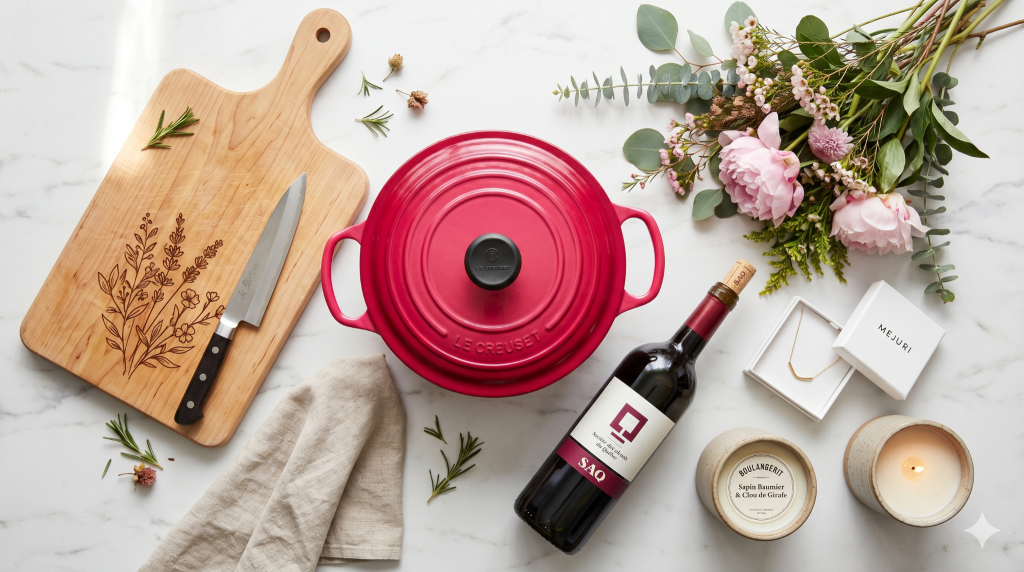 - Cocotte Le Creuset gravée : un investissement cuisine pour la vie, personnalisable avec leurs initiales. La pièce maîtresse qui passe de la cuisinière à la table.