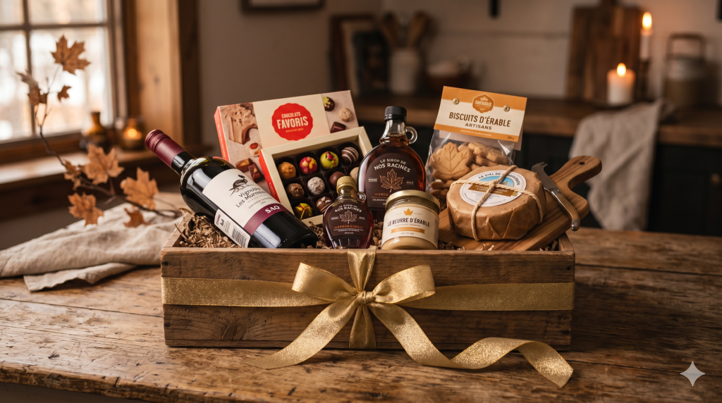 - Panier gourmand du terroir : produits de l’érable, Chocolats Favoris, fromages d’artisans québécois et épices fines. Un beau cadeau qui célèbre le Québec et qui se partage à deux.